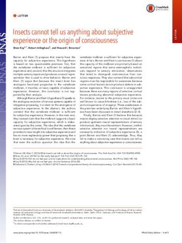 Key, B., Arlinghaus, R., Browman, H. I. (2016). Insects cannot tell us anything about subjective experience or the origin of consciousness. Proceedings of the National Academy of Sciences of the United States of America, 113, 201606835