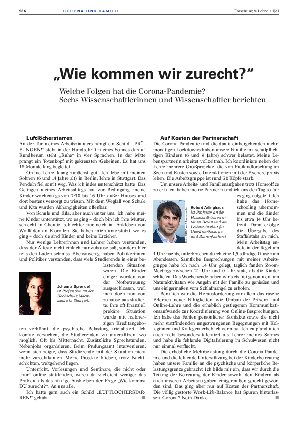 Arlinghaus, R., Lippke, S., Wiethoff, S., Birkhofer, K., Agricola, I. 2021. Wie kommen wir zurecht?. Forschung und Lehre, 11/2021.