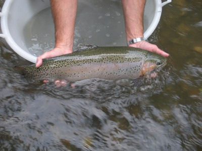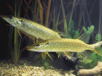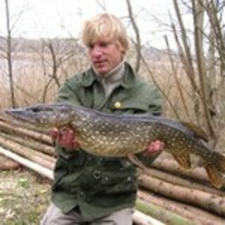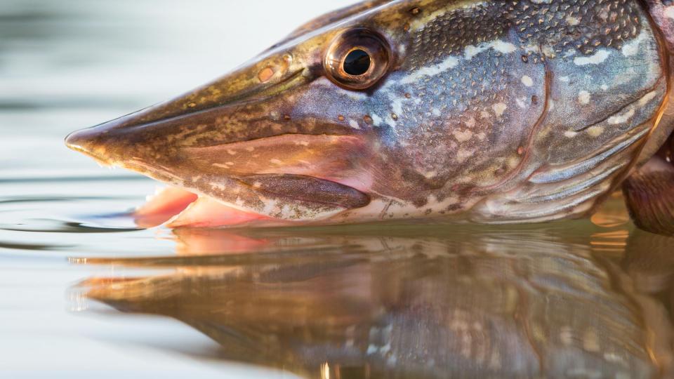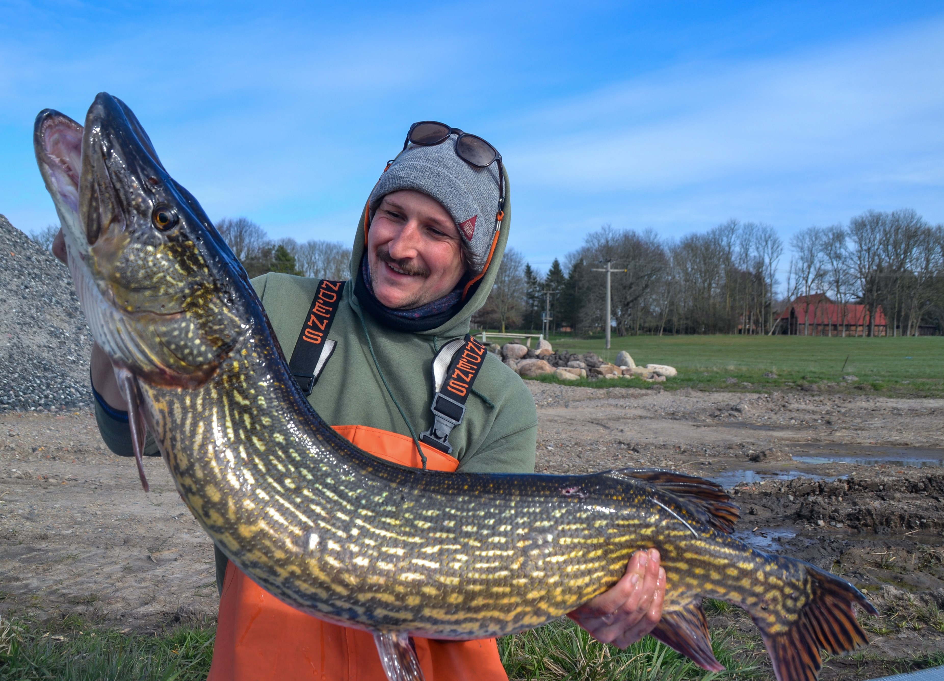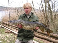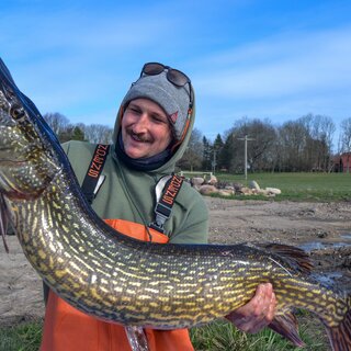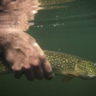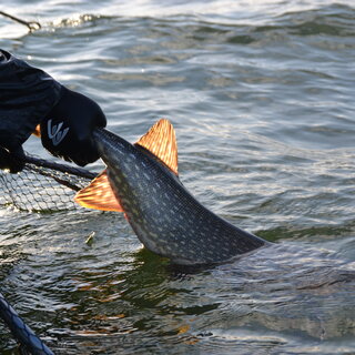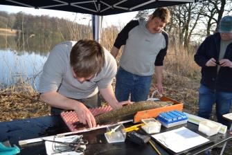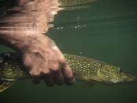 Ein großer Hecht wurde mit einer Marke versehen (auf Höhe der Rückenflosse zu sehen) und wird nun ins Wasser zurückgesetzt.