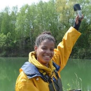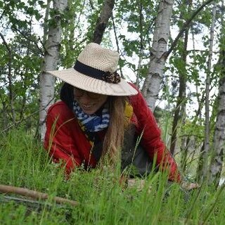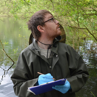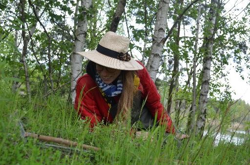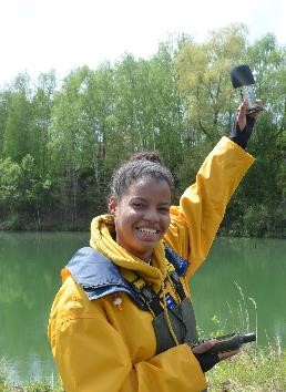 Malwina Schafft bestimmt Pflanzen am Ufer eines Baggersees.