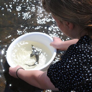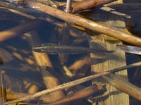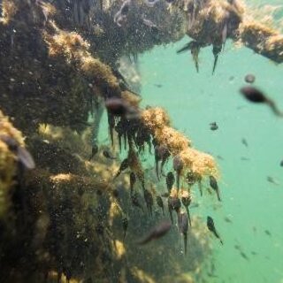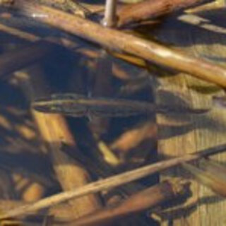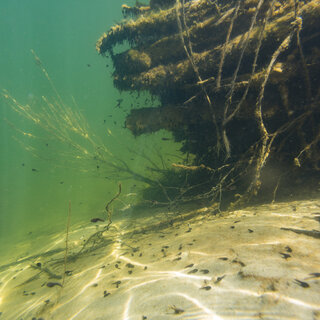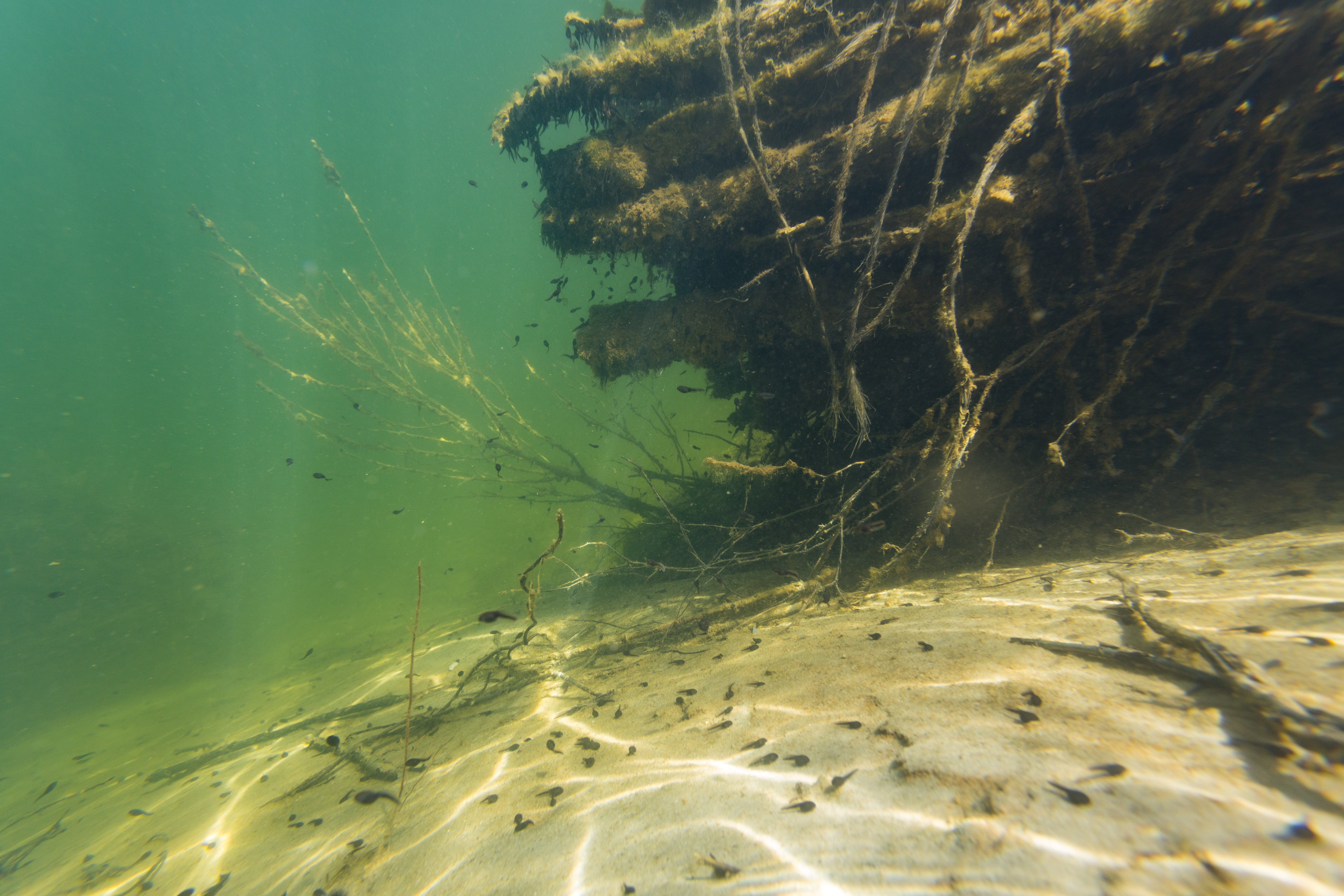 Kaulquappen verstecken sich in einem Totholzbündel, welches Angelvereine im Baggersee versenkt haben.