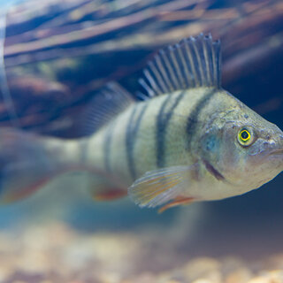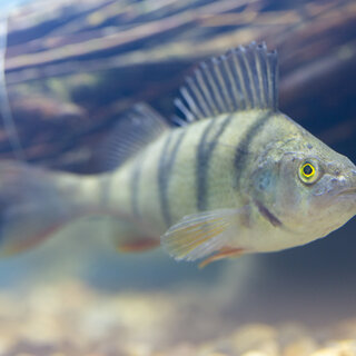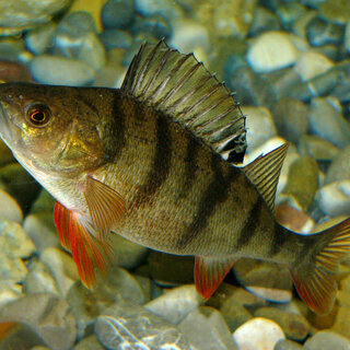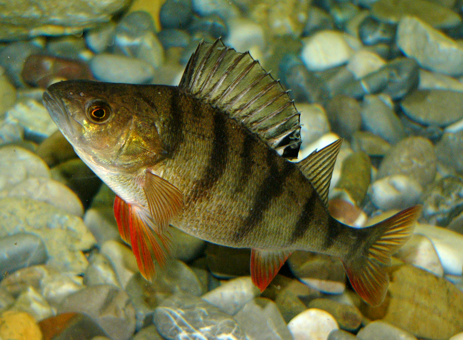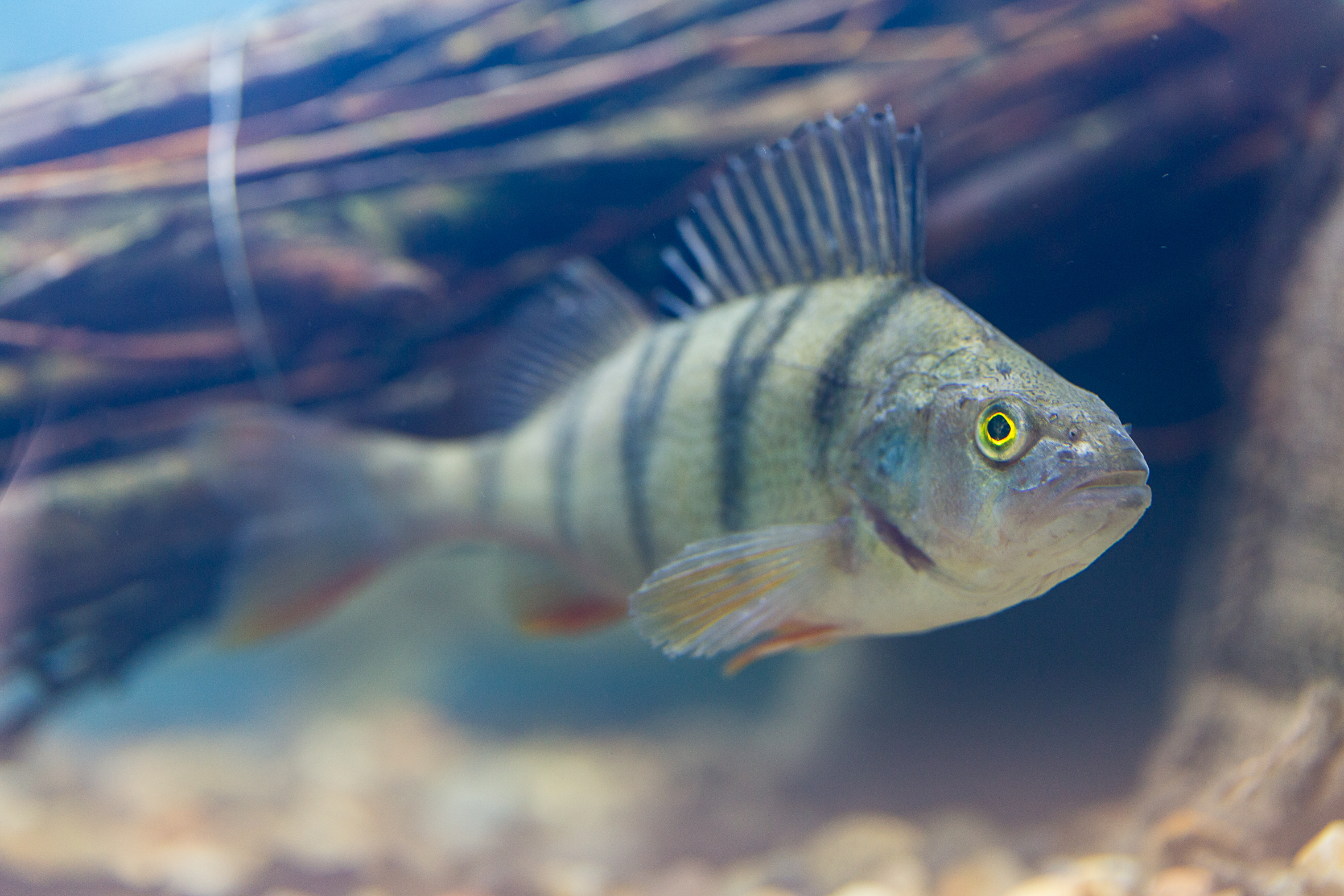 Ein Flussbarsch (Perca fluviatilis) ist eine typische Fischart in Baggerseen