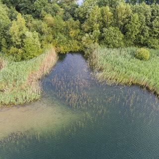 Wasserpflanzen in einem Flachwasserbereich in einem Baggersee