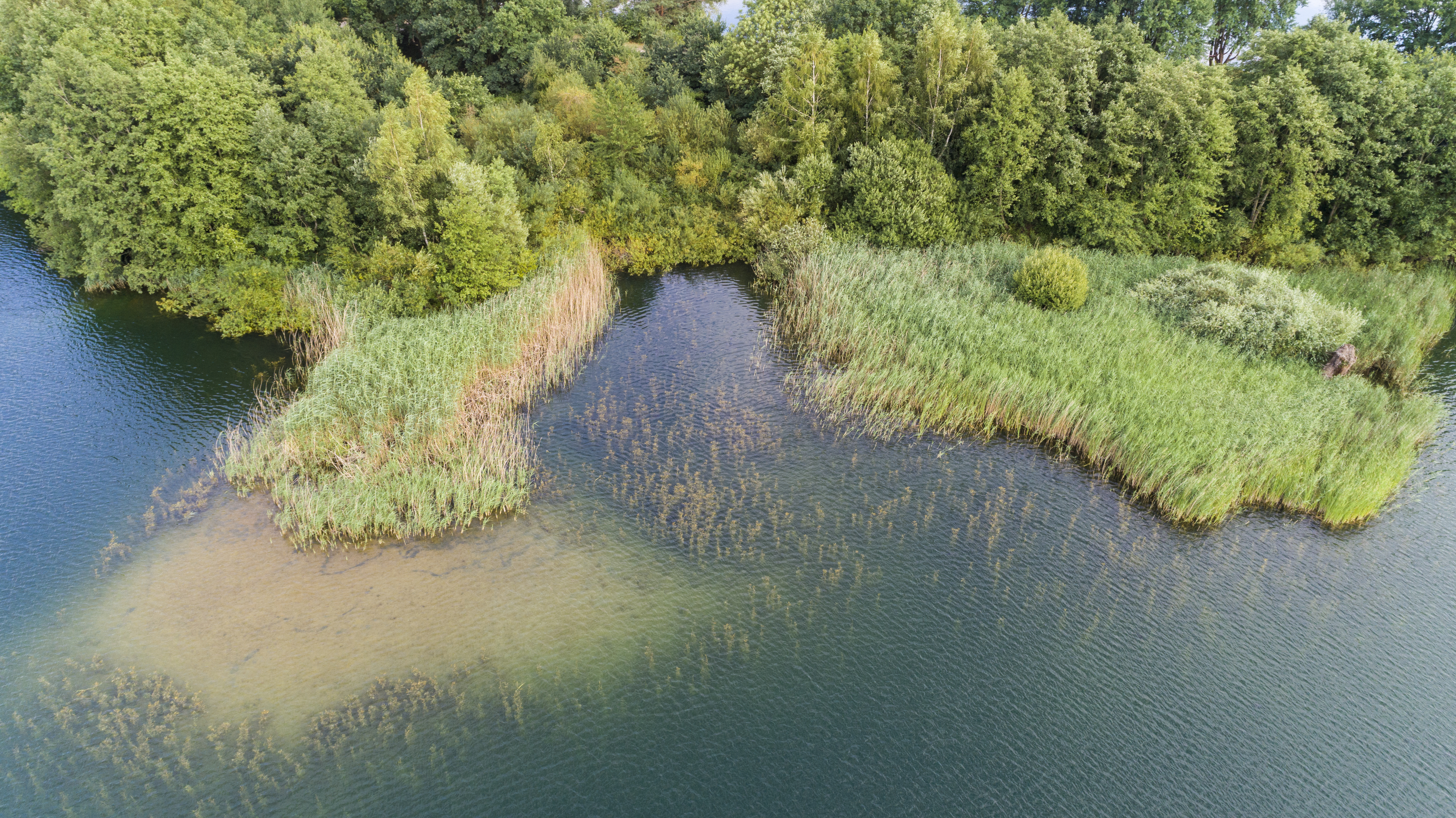 Flachwasserzone, die nach 16 Monaten nach der Entstehung mit Wasserpflanzen besiedelt ist