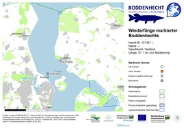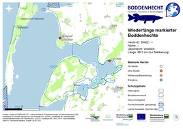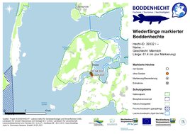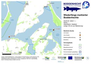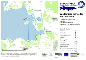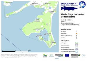 Hierbei unterschieden wir zwischen den einfach markierten Hechten (ohne Peilsender), diese trugen eine oder manchmal auch zwei orange Fähnchenmarken neben der Rückenflosse, und den weiß markierten Hechten (ein oder zwei weiße Fähnchenmarken neben der Rückenflosse). Die „Weißen“ trugen entweder interne, von außen nicht sichtbare, Sender oder von außen deutlich sichtbare Rucksacksender. Die Wanderrouten der Hechte mit internem Sender konnten neben den Fangmeldungen durch Angler:innen und Fischer:innen zusätzlich über 140 Stationen mit Unterwassermikrofonen in den Bodden rekonstruiert werden, bei den orange markierten Hechten ohne Sender und den Hechten mit Rucksacksender war dies nicht möglich. Hier waren wir Forscherinnen und Forscher ausschließlich auf Ihre Fangmeldung angewiesen.