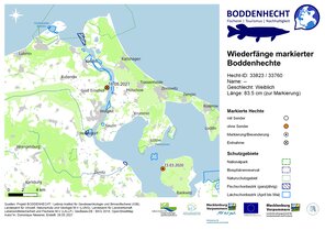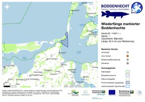 Ein Hauptanliegen der Markierungsstudie im BODDENHECHT Projekt war es herauszufinden, ob und wenn ja wie die Hechte zwischen einzelnen Bodden und auch zwischen Bodden und Süßwasserzuflüssen wandern. Durch die Meldung von Fängen markierter und/oder besenderter Boddenhechte durch Angler:innen und Fischer:innen, war es möglich, die Wanderstrecken der Fische nachzuverfolgen.