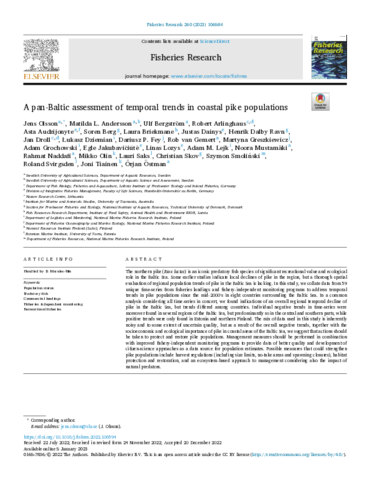 Ollson, J., Andersson, M.L., Bergström, U., Arlinghaus, R., Audzijonyte, A., Berg, S., Briekmane, L., Dainys, J., Dalby Ravn, H., Droll, J., Dziemian, L., Fey, D.P., van Gemert, R., Greszkiewicz, M., Grochowski, A., Jakubaviciute, E., Lozys, L., Lejk, A.M., Mustamäki, N., Naddafi, R., Olin, M., Saks, L., Skov, C., Smolinski, S., Svirgsden, R., Tiainen, J., Östman, Ö. 2023. A pan-Baltic assessment of temporal trends in coastal pike populations. Fisheries Research, 260, 1-14.