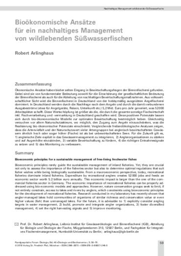 Arlinghaus, R. (2019). Bioökonomische Ansätze für ein nachhaltiges Management von wildlebenden Süßwasserfischen. pp. 59-70 In: Ökologie und Bioökonomie. Neue Konzepte zur umweltverträglichen Nutzung natürlicher Ressourcen. 2019. Rundgespräche Forum Ökologie, Band 48. 140 Seiten. Hrsg.: Bayerische Akademie der Wissenschaften. Verlag Dr. Friedrich Pfeil, München. ISBN 978-3-89937-246-5