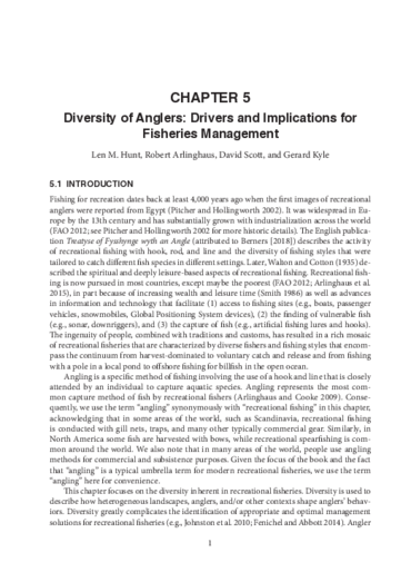 Hunt, L.M., Arlinghaus, R., Scott, D., Kyle, G. 2023. Diversity of Anglers: Drivers and Implications for Fisheries Management, Chapter 5, 1-28. In: Neal, J.W., Lang, T.J., Krogman, R.M., Kurzawaski, K.F., Hunt, K.M, Taylor, J.B. (eds.) Angler Recruitment, Retention, and Reactivation: The Future of Fisheries and Aquatic Conservation Summary and Synthesis. American Fisheries Society.