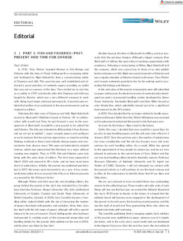 Hart, P. J. B., Carvalho, G., Arlinghaus, R. 2022. Editorial. Fish and Fisheries, 23, 1-3.