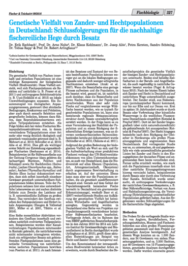 Eschbach, E., Nolte, A., Kohlmann, K., Alós, J., Kersten, P., Schöning, S., Rapp, T., Arlinghaus, R. (2016). Genetische Vielfalt von Zander- und Hechtpopulationen in Deutschland: Schlussfolgerung für die nachhaltige fischereiliche Hege durch Besatz. Fischer & Teichwirt 09/2016, 327-330