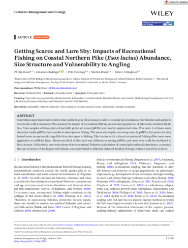 Roser, P., Radinger, J., Feldhege, F., Braun, M. and Arlinghaus, R. (2024), Getting Scarce and Lure Shy: Impacts of Recreational Fishing on Coastal Northern Pike (Esox lucius) Abundance, Size Structure and Vulnerability to Angling. Fish Manag Ecol e12769. https://doi.org/10.1111/fme.12769