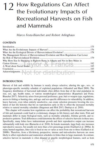 This chapter will examine how regulations can affect the probability that recreational harvests of fish and mammals could lead to evolutionary changes in life history and other traits. Fish and mammals differ in many biological traits, such as mortality schedules, lifetime growth, and reproductive patterns. Trait differences could determine the effects of selective harvests in these taxa. Specifically, many fishes have indeterminate growth and their reproductive output can increase substantially with body size (Barneche et al. 2018). In female mammals, large body size increases reproductive success, but usually not more than a few percentage points (Gaillard et al. 2000a). In many hunted ungulates, litter size is fixed at one or varies at most from one to three (Gaillard et al. 2000b). Therefore, from a life-history perspective, intense and trait-selective harvests are more likely to affect reproduction and maturation schedules in fishes than in large mammals. In contrast, selective harvest in mammals is often directed at specific morphological features, such as horn size—a type of selective harvest not found in recreational fishing, where body size is often a key target (Beardmore et al. 2015). Hence, we expect that harvest-induced evolution will mostly affect morphological traits desired by hunters in mammals, whereas a range of traits may evolve in recreational fisheries (Matsumura et al. 2011, Arlinghaus et al. 2017b). In fishes, there is ample experimental and modeling evidence that body size can be affected by intense, persistent, and selective harvests (Conover and Munch 2002, Edeline et al. 2009, Ahti et al. 2020). In both mammals and fishes, selective harvesting can also drive behavioral changes (Arlinghaus et al. 2017b, Leclerc et al. 2017).