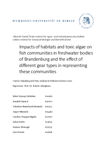 Daldaban, B.Z., Emmel, H., Masinde, V.N., Münnich, J., Nguku, C.W., Reiter, L., Thonagel, H., Wende, L. 2022. Impacts of habitats and toxic algae on fish communities in freshwater bodies of Brandenburg and the effect of different gear types in representing these communities. Studentenprojekt, Humboldt-Universität zu Berlin, Leibniz-Institut für Gewässerökologie und Binnenfischerei (IGB) Berlin.