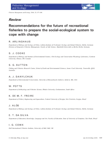 Arlinghaus, R., Cooke, S.J., Sutton, S.G., Danylchuk, A.J., Potts, W., Freire, K.d.M.F., Alós, J., Silva, E.T. da, Cowx, I.G. (2016). Recommendations for the future of recreational fisheries to prepare the social-ecological system to cope with change. Fisheries Management and Ecology, 2016, 23, 177–186