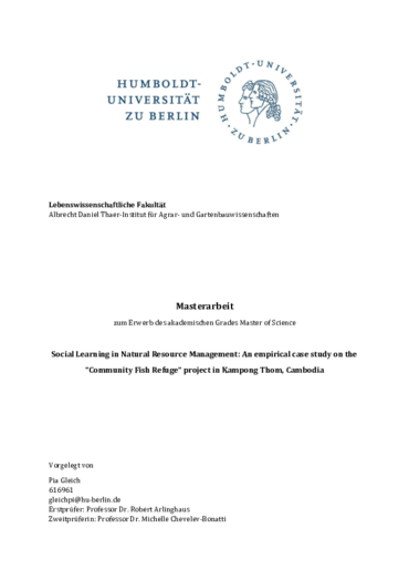 Gleich, P. 2024. Social Learning in Natural Resource Management: An empirical case study on the "Community Fish Refuge" project in Kampong Thom, Cambodia. Master-Thesis, Humboldt-Universität zu Berlin, Leibniz-Institut für Gewässerökologie und Binnenfischerei (IGB) Berlin.