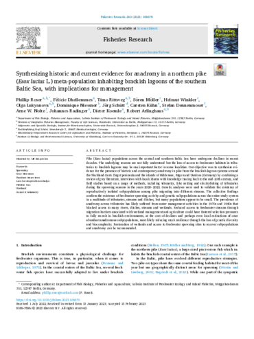 Roser, P., Dhellemmes, F., Rittweg, T., Möller, S., Winkler, H., Lukyanova, O., Niessner, D., Schütt, J., Kühn, C., Dennenmoser, S., Nolte, A.W., Radinger, J., Koemle, D., Arlinghaus, R. 2023. Synthesizing historic and current evidence for anadromy in a northern pike (Esox lucius L.) meta-population inhabiting brackish lagoons of the southern Baltic Sea, with implications for management. Fisheries Research, 263, 106670.