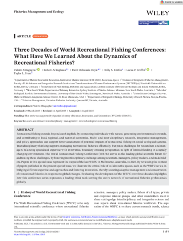 Sbragaglia, V., Arlinghaus, R., Ochwada-Doyle, F., Embke, H.S., Griffin, L.P. and Hunt, T.L. (2025), Three Decades of World Recreational Fishing Conferences: What Have We Learned About the Dynamics of Recreational Fisheries?. Fisheries Management and Ecology e12815. https://doi.org/10.1111/fme.12815