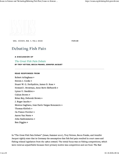 R. Arlinghaus, S. J. Cooke, S. W. G. Derbyshire, J. D. Rose, H. I. Browman, A. B. Skiftesvik, L. U. Sneddon, C. Brown, B. Key, D. Brown, J. R. Jacobs, M. Gagliano, I. D. V. Roncancio, T. Klefoth, I. F. Porcher, A. V. Neste, J. Sanbonmatsu, B. Diggles