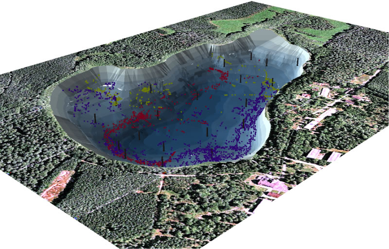 Unser Forschungssee "Kleiner Döllnsee" ist mit einem akustischen Telemetrie System (Lotek Wireless, Canada), bestehend aus über 20 Sendern, welche über den gesamten See verteilt sind, ausgestattet. Die automatische Datenaufnahme ermöglicht es uns Fische, welche mit einem Transmitter bestückt sind, mit einer hohen dreidimensionalen Auflösung über mehrere Jahre zu lokalisieren. Dies hilft uns zu verstehen was die Fische zu jeder Tageszeit machen und wie diese auf Umweltveränderungen und verschiedene Habitattypen reagieren. Weltweit gibt es nur sehr wenige vergleichbare Systeme, welche es ermöglichen, Fische über einen langen Zeitraum im ganzen Seekomplex zu beobachten. Mittlerweile haben wir eine große Anzahl an Datensätzen über den Hecht, Wels, Flussbarsch, Schleie sowie Schuppenkarpfen.